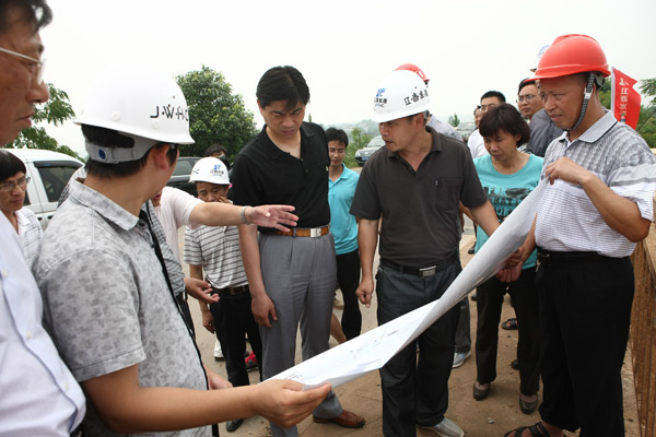 孫曉山廳長一行深入查看了樟山庫區(qū)防護工程的施工現(xiàn)場,并認真聽取了我公司項目經(jīng)理彭紅軍對工程整體布置、進度及工程施工中遇到的困難和問題等的簡要匯報。樟山防護工程施工戰(zhàn)線長、作業(yè)難度大、牽涉的范圍點多面廣,是峽江水利樞紐庫區(qū)防護工程施工難度最大的項目之一,孫廳長對工程進展情況非常關(guān)心。聽取匯報后,孫廳長指出:一是要做好民生工程,做好移民、征地、拆遷等工作,為工程施工提供便利;二是要爭取早日施工,在早稻收割完成后立即進行工程施工,確保工程于明年7月份完成主體工程;三要合理安排施工工期,確保峽江水利樞紐蓄水及第一臺發(fā)電機組按期發(fā)電。