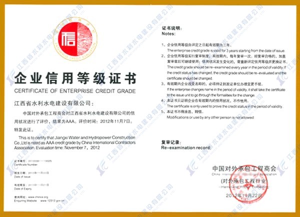 根據(jù)商務(wù)部、國資委聯(lián)合發(fā)布的《商會協(xié)會行業(yè)信用建設(shè)工作指導(dǎo)意見》的要求,中國對外承包工程商會于2012年9月啟動2012年度對外承包工程與勞務(wù)合作企業(yè)信用等級評價工作。經(jīng)對外承包工程與勞務(wù)合作企業(yè)信用等級評審委員會第八次工作會議審議,江西省水利水電建設(shè)有限公司被評定為2012年度對外承包工程企業(yè)信用評價AAA級信用企業(yè)。