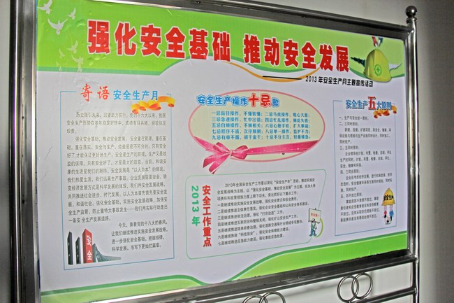 集團(tuán)資訊按照2013年“安全生產(chǎn)月”活動實(shí)施方案要求,公司所屬各單位張貼、懸掛安全生產(chǎn)警示語,突出宣傳“強(qiáng)化安全基礎(chǔ),推動安全發(fā)展”的活動主題。
