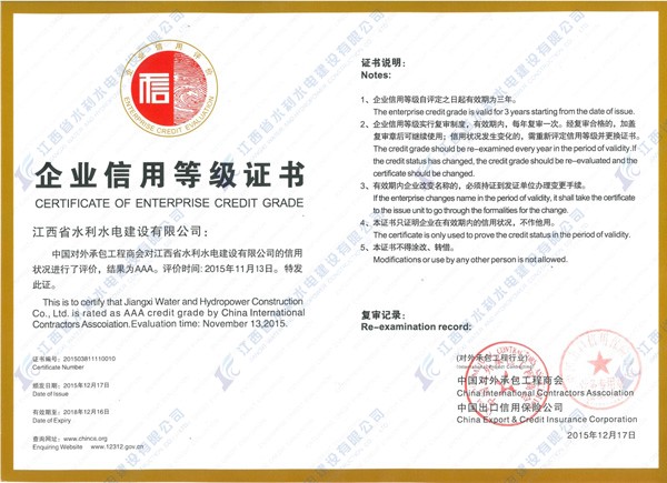 集團(tuán)資訊根據(jù)商務(wù)部、國(guó)資委聯(lián)合發(fā)布的《商會(huì)協(xié)會(huì)行業(yè)信用建設(shè)工作指導(dǎo)意見(jiàn)》和《關(guān)于進(jìn)一步做好行業(yè)信用評(píng)價(jià)工作的意見(jiàn)》的要求,結(jié)合承包商會(huì)關(guān)于推進(jìn)行業(yè)信用體系建設(shè)的工作部署,承包商會(huì)于2015年7月啟動(dòng)2015年度對(duì)外承包工程企業(yè)與勞務(wù)合作企業(yè)信用等級(jí)評(píng)價(jià)工作,經(jīng)對(duì)外承包工程企業(yè)與勞務(wù)合作企業(yè)信用等級(jí)評(píng)審委員會(huì)第十一次工作會(huì)議審議,江西省水利水電建設(shè)有限公司被評(píng)定為2015年度對(duì)外承包工程企業(yè)信用評(píng)價(jià)AAA級(jí)信用企業(yè)。