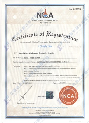 江西省水利水電建設有限公司肯尼亞分公司接到通告后,積極準備相關資料,憑借公司的技術實力和肯尼亞市場的良好業(yè)績,最終取得所有六項的一級證書。其中包括:水利施工一級,公路工程施工一級,房屋建筑工程施工一級,結構施工一級,電力工程施工一級和機電工程施工一級,有力地提升公司的品牌影響,提升了公司資信競爭力,為公司在肯尼亞各項工作的全面深入開展創(chuàng)造了積極有利的條件。