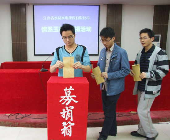 2010年4月14日,青海省玉樹縣發(fā)生兩次地震,最高震級7.1級,造成了當(dāng)?shù)鼐薮蟮娜松韨龊拓敭a(chǎn)損失,“玉樹地震”牽動著億萬人民的心,也牽動著我司所有員工的心!公司在全司范圍內(nèi)積極開展“情系玉樹募捐活動”,4月26日,我公司南昌市機(jī)關(guān)總部首先開展了“情系玉樹募捐活動”,公司中層以上管理人員和員工踴躍參與募捐活動,紛紛獻(xiàn)上自己的一份愛心,體現(xiàn)出江西水總?cè)说纳鐣?zé)任感!同時,各分公司、國內(nèi)外施工項目部也在開展此項活動,預(yù)計此項活動將募得資金3萬余元。